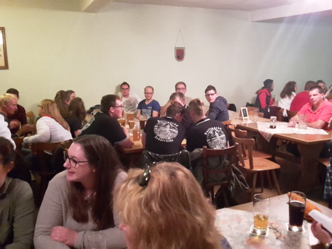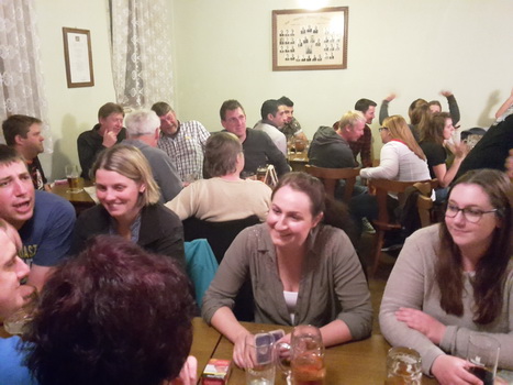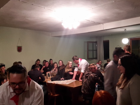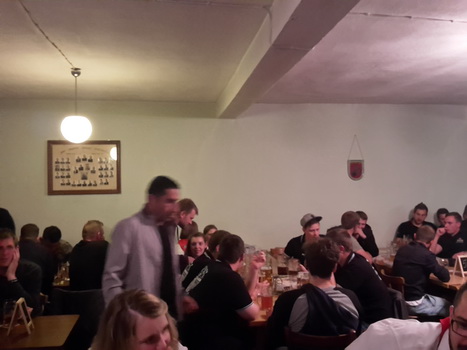 Ruckzuck wor der Saal heier wieder voll. A Bier, a Musi, Holadrio! Do gfällts uns. Der Kerwa-Veteran hängt a nu recht an der Liesl.